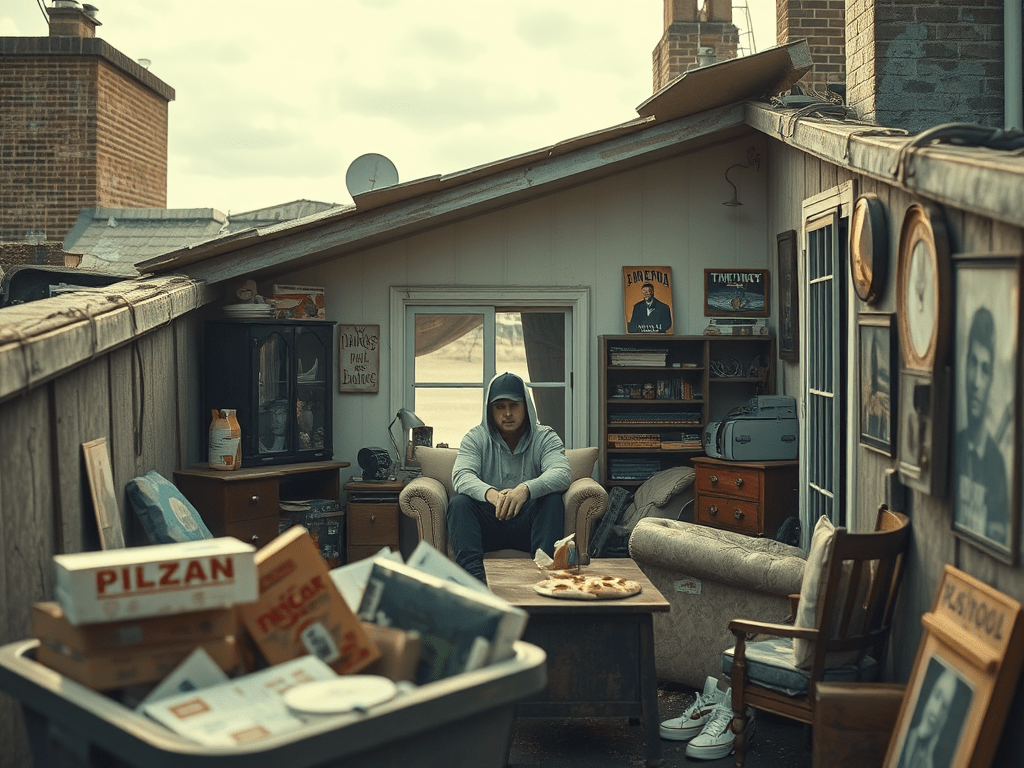 I dreamed I saw Eminem w living in a tiny flat w a broken roof. I went to see him; and brought him some waterproof trainer covers, a quilt cover, that matched w he had, w seemed to be a synchronicity.